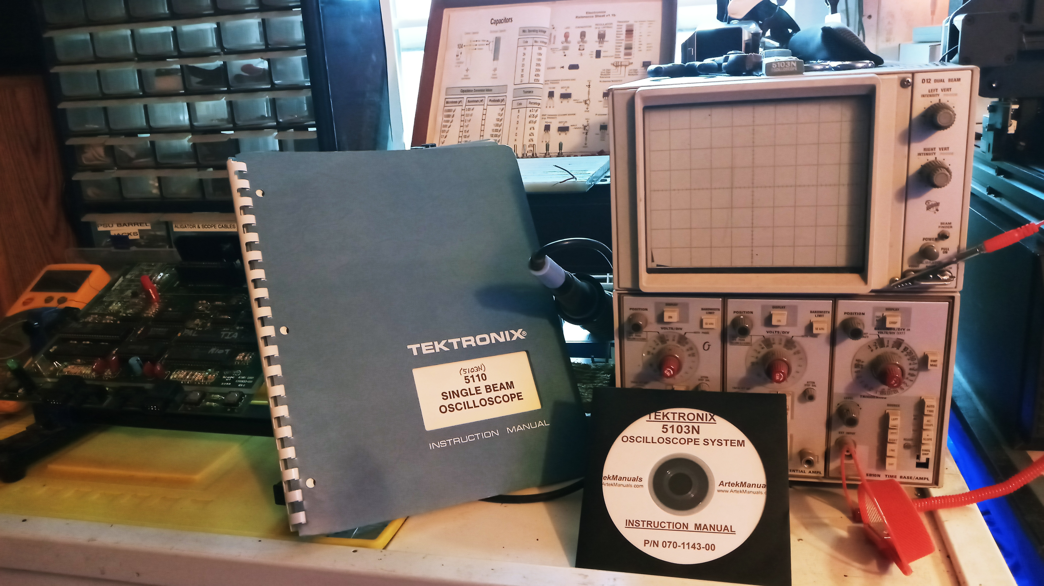 The manual for my Tektronix 5301N arrived. Sort of...I'm going to keep it because most of the basics cover my oscilloscope too, but the 5301N/D10 is a single beam and the 5301N/D12 (my actual model) is a dual-beam (later models are renamed 5110 and 5112). But, I wisely decided to order a a CDR version from another vendor as well ($20 for manual, $10 for CDR), which is the proper pin number for my machine.