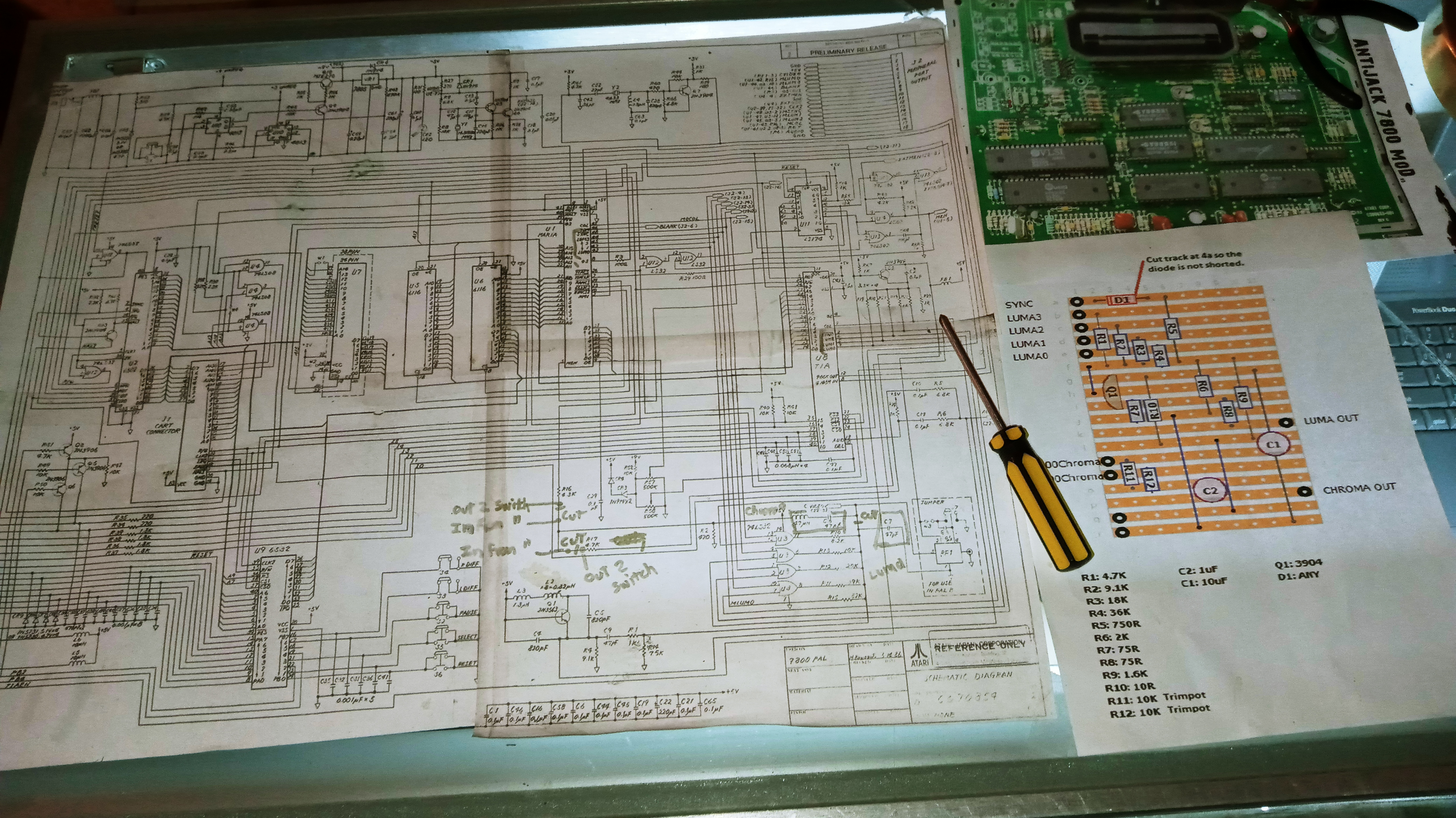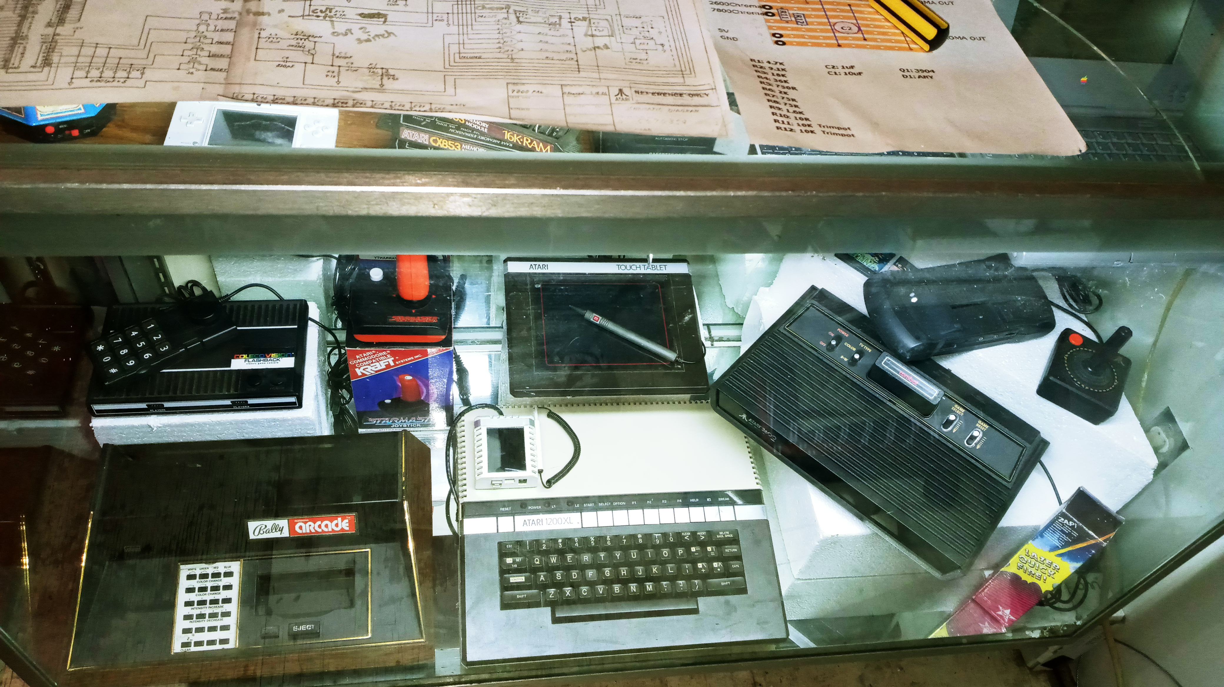 When I'm forced to rely on PDF's, I go to drastic measures sometimes, like the Atari 7800 schematic I printed out across four pages and then taped them together into a poster size print out. My glass display case makes a pretty good make-shift back-lighted drafting table. (like I had until it was stolen from storage) I figure I might as well include a couple of shots of my current display case set-up, since I've installed some mirrors and staging foam (which will be painted or covered eventually)